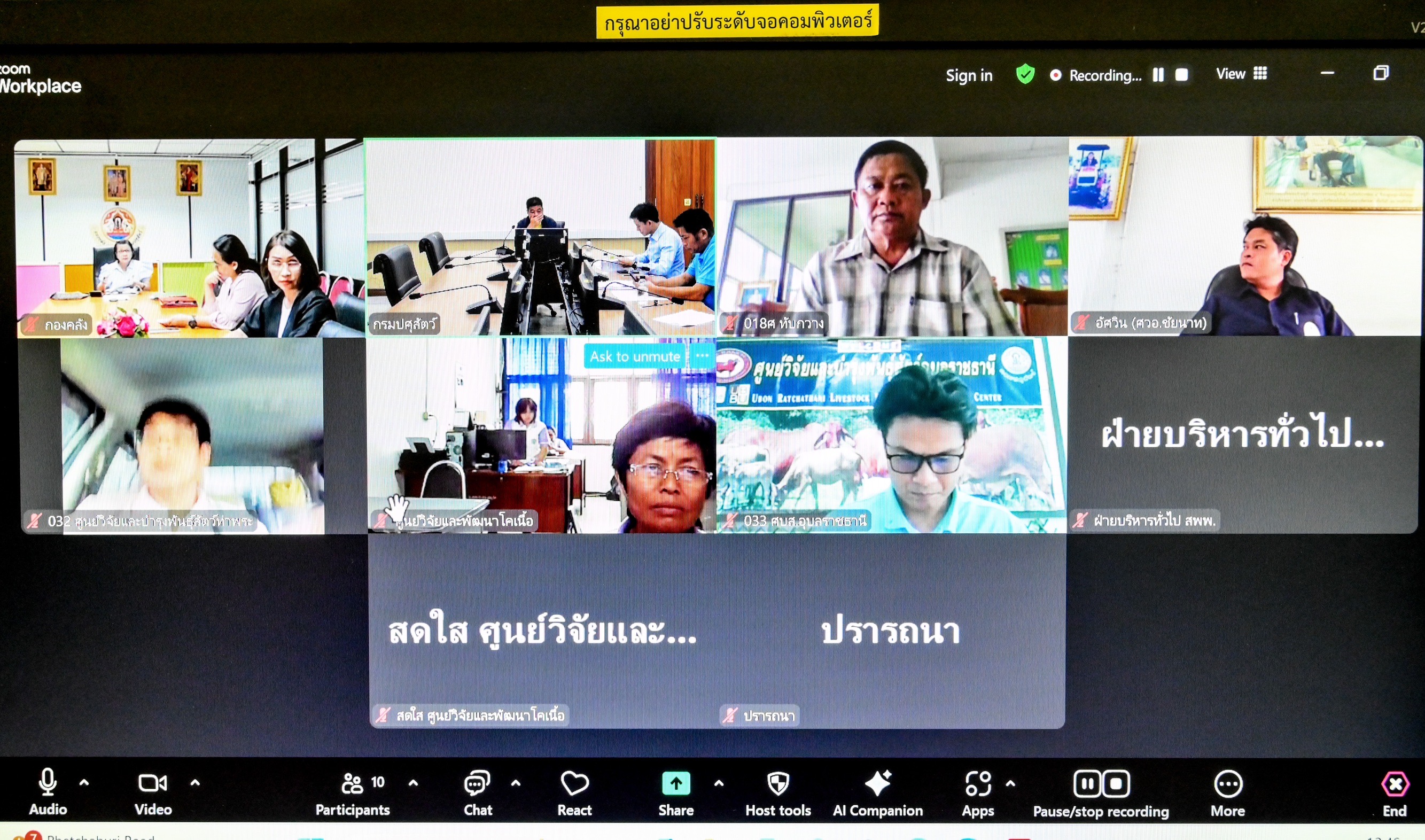 วันที่ 23 พฤษภาคม 2568 นายสัตวแพทย์สมชวน รัตนมังคลานนท์ อธิบดีกรมปศุสัตว์ มอบหมายให้นายพงษ์พันธ์ ธรรมมา รองอธิบดีกรมปศุสัตว์ เป็นประธานการประชุมคณะกรรมการพิจารณาการขอใช้พื้นที่ที่กรมปศุสัตว์ครอบครองและใช้ประโยชน์ครั้งที่ 7/2568 โดยมีนางสาวจุไรรักษ์ อุนาภีร์ ผู้อำนวยการกองคลัง และคณะกรรมการที่เกี่ยวข้องเข้าร่วมการประชุมฯ เพื่อพิจารณาการขอใช้พื้นที่ที่กรมปศุสัตว์ครอบครองและใช้ประโยชน์ขององค์การบริหารส่วนตำบลท่าพระ ศูนย์วิจัยและพัฒนาโคเนื้อ การไฟฟ้าส่วนภูมิภาค เขต1 (ภาคกลาง) ศูนย์วิจัยและบำรุงพันธุ์สัตว์อุบลราชธานี ธนารักษ์พื้นที่ลพบุรี และสำนักงานเทศบาลตำบลหนองขุ่น ณ ห้องประชุมม้ากัณฐกะ ตึกอำนวยการ กรมปศุสัตว์ และประชุมออนไลน์ผ่านระบบ Zoom Meeting