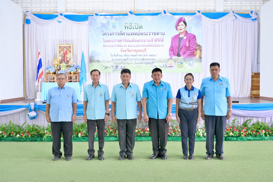วันพุธที่ 28 พฤษภาคม 2568 เวลา 09.00 น. นายสัตวแพทย์บุญญกฤช ปิ่นประสงค์ รองอธิบดีกรมปศุสัตว์ เป็นประธานเปิดโครงการสัตวแพทย์พระราชทานฯ ว่าที่ ร.ต. ศุภมงคล บูชาถ่ายเทศ รองผู้ว่าราชการจังหวัดกาญจนบุรี กล่าวต้อนรับ และนายสัตวแพทย์สามารถ ประสิทธิ์ผล ปศุสัตว์จังหวัดกาญจนบุรี กล่าวรายงานวัตถุประสงค์การจัดงานฯ ทั้งนี้ เพื่อน้อมสำนึกในพระมหากรุณาธิคุณ สมเด็จพระนางเจ้าสิริกิติ์ พระบรมราชินีนาถ พระบรมราชชนนีพันปีหลวง ที่ทรงมีพระราชดำริให้มีโครงการสัตวแพทย์พระราชทานเพื่อให้หน่วยงานวิชาชีพสัตวแพทย์ และวิชาชีพอื่นๆ ที่เกี่ยวข้อง เข้าไปดูแลสุขภาพสัตว์เลี้ยงของเกษตรกรในพื้นที่ห่างไกล เป็นการพัฒนาอาชีพและเพิ่มรายได้ของเกษตรกรให้มีความเป็นอยู่ที่ดีขึ้น โดยมีคณะกรรมการโครงการสัตวแพทย์พระราชทานฯ หัวหน้าส่วนราชการ คณาจารย์ นิสิต นักศึกษา ผู้นำท้องที่ ผู้นำท้องถิ่น พี่น้องเกษตรกรผู้เลี้ยงสัตว์ เข้าร่วมพิธีเปิดฯ ณ หอประชุมที่ว่าการอำเภอห้วยกระเจา อำเภอห้วยกระเจา จังหวัดกาญจนบุรี