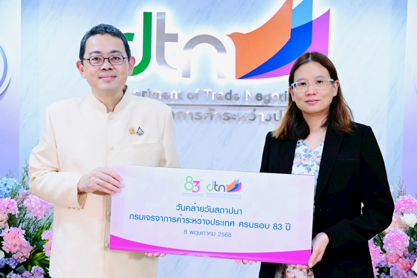 วันพฤหัสบดีที่ 8 พฤษภาคม 2568 เวลา 10.30 น. นายสัตวแพทย์สมชวน รัตนมังคลานนท์ อธิบดีกรมปศุสัตว์ มอบหมายให้นางสาวบุณิกา จุลละโพธิ เลขานุการกรม ร่วมแสดงความยินดีงานวันคล้ายวันสถาปนากรมเจรจาการค้าระหว่างประเทศ และได้ร่วมบริจาคสมทบทุนเพื่อสาธารณประโยชน์กองทุนสวัสดิการกรมเจรจาการค้าระหว่างประเทศ ณ กรมเจรจาการค้าระหว่างประเทศ ถนนนนทบุรี ตำบลบางกระสอ อำเภอเมืองนนทบุรี จังหวัดนนทบุรี