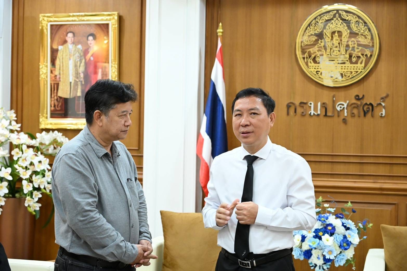 วันอังคารที่ 24 กุมภาพันธ์ 2569 นายสัตวแพทย์สมชวน รัตนมังคลานนท์ อธิบดีกรมปศุสัตว์ กล่าวชื่นชมความมุ่งมั่นและความทุ่มเทของคณะเจ้าหน้าที่จากสำนักพัฒนาพันธุ์สัตว์ ศูนย์วิจัยและพัฒนาโคเนื้อ จังหวัดลพบุรี ในโอกาสเข้าพบเพื่อรายงานผลความสำเร็จในการประกวดโคเนื้อบึงสามพัน ครั้งที่ 18 พร้อมทั้งอัญเชิญถ้วยรางวัลพระราชทานสมเด็จพระกนิษฐาธิราชเจ้า กรมสมเด็จพระเทพรัตนราชสุดาฯ สยามบรมราชกุมารี รางวัลชนะเลิศ GRAND CHAMPION GRAY BRAHMAN BULL โดยเก็บรักษาไว้ ณ กรมปศุสัตว์ พญาไท กรุงเทพฯ เพื่อความเป็นสิริมงคลและเป็นขวัญกำลังใจให้แก่ข้าราชการและเจ้าหน้าที่ในการมุ่งมั่นพัฒนาภาคปศุสัตว์ไทย โดยมีนายสัตวแพทย์มนัส เทพรักษ์ รองอธิบดีกรมปศุสัตว์ นายดนัย คำขวัญ ผู้อำนวยการสำนักพัฒนาพันธุ์สัตว์ เข้าร่วมฯ