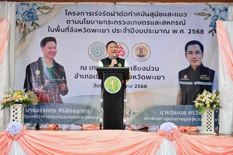 นายอรรถกร ศิริลัทธยากร รัฐมนตรีว่าการกระทรวงเกษตรและสหกรณ์ มอบหมายนายสัตวแพทย์สมชวน รัตนมังคลานนท์ อธิบดีกรมปศุสัตว์ เป็นประธานพิธีเปิดโครงการเร่งรัดผ่าตัดทำหมันสุนัขและแมวเพื่อควบคุมป้องกันโรคพิษสุนัขบ้าในพื้นที่เสี่ยง ภายใต้โครงการสัตว์ปลอดโรค คนปลอดภัยจากโรคพิษสุนัขบ้า ตามพระปณิธาน ศาสตราจารย์ ดร.สมเด็จเจ้าฟ้าฯ กรมพระศรีสวางควัฒน วรขัตติยราชนารี ปีงบประมาณ พ.ศ. 2568 ณ หอประชุมเทศบาลตำบลเชียงม่วน อ.เชียงม่วน จ.พะเยา