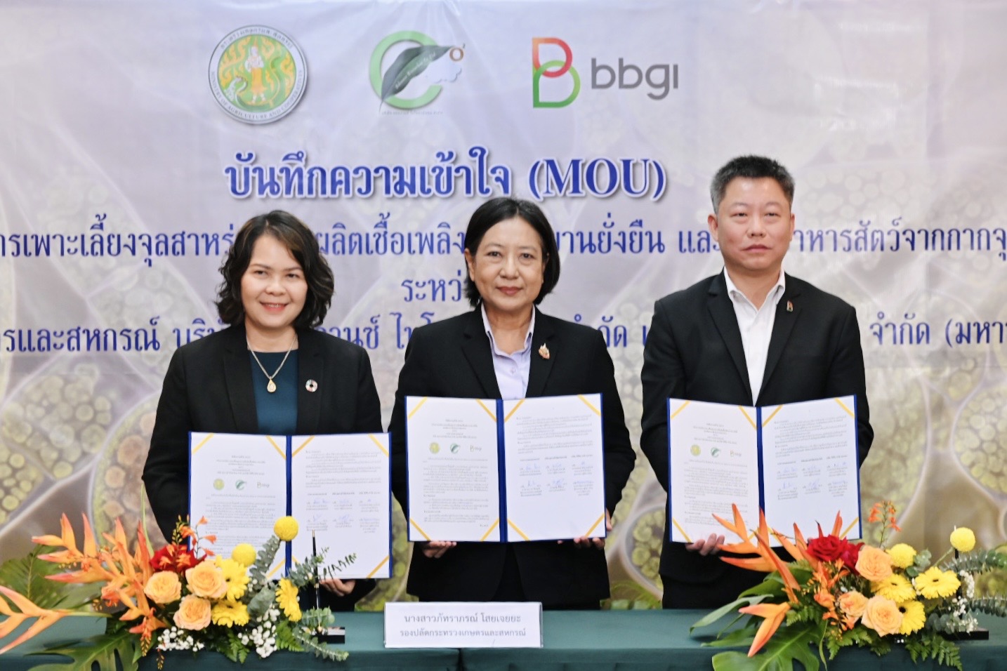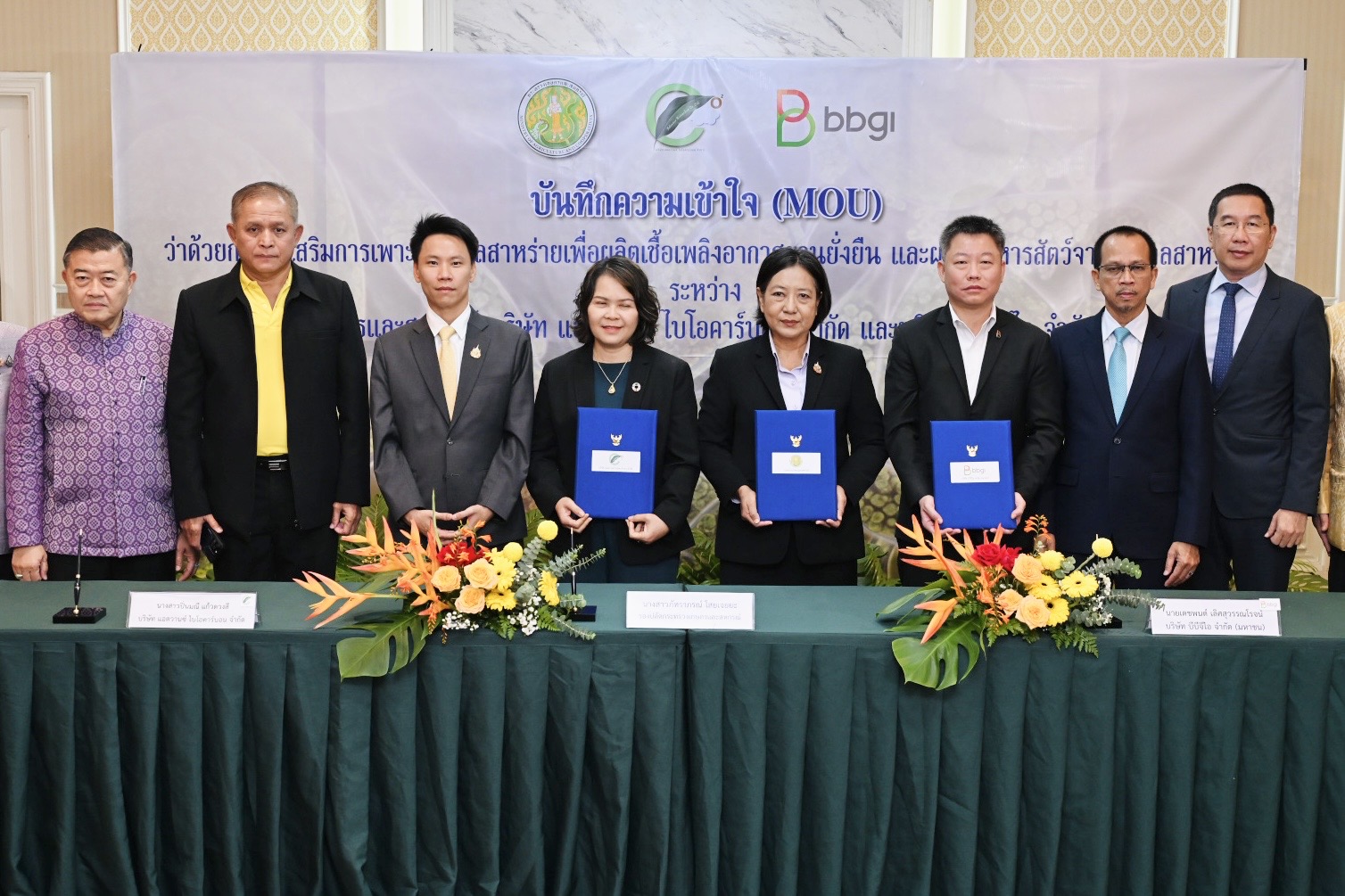 วันอังคารที่ 2 กันยายน 2568 เวลา 09.30 น. นายสัตวแพทย์สมชวน รัตนมังคลานนท์ อธิบดีกรมปศุสัตว์ พร้อมด้วยนายสัตวแพทย์ยุทธนา โสภี ผู้อำนวยการสำนักพัฒนาระบบและรับรองมาตรฐานสินค้าปศุสัตว์ เข้าร่วมพิธีลงนามฯ โดยมีนายอรรถกร ศิริลัทธยากร รัฐมนตรีว่าการกระทรวงเกษตรและสหกรณ์ เป็นประธานพิธีลงนามบันทึกความเข้าใจ (MOU) ว่าด้วยการส่งเสริมการเพาะเลี้ยงจุลสาหร่ายเพื่อผลิตเชื้อเพลิงอากาศยานยั่งยืนและผลิตอาหารสัตว์จากกากจุลสาหร่าย ระหว่างกระทรวงเกษตรและสหกรณ์ บริษัท แอดวานซ์ ไบโอคาร์บอน จำกัด และบริษัท บีบีจีโอ จำกัด (มหาชน) โดยมีผู้บริหารในสังกัดกระทรวงเกษตรและสหกรณ์ และเจ้าหน้าที่ที่เกี่ยวข้อง เข้าร่วมฯ ณ ห้องประชุม 115 กระทรวงเกษตรและสหกรณ์ ราชดำเนิน กรุงเทพฯ
