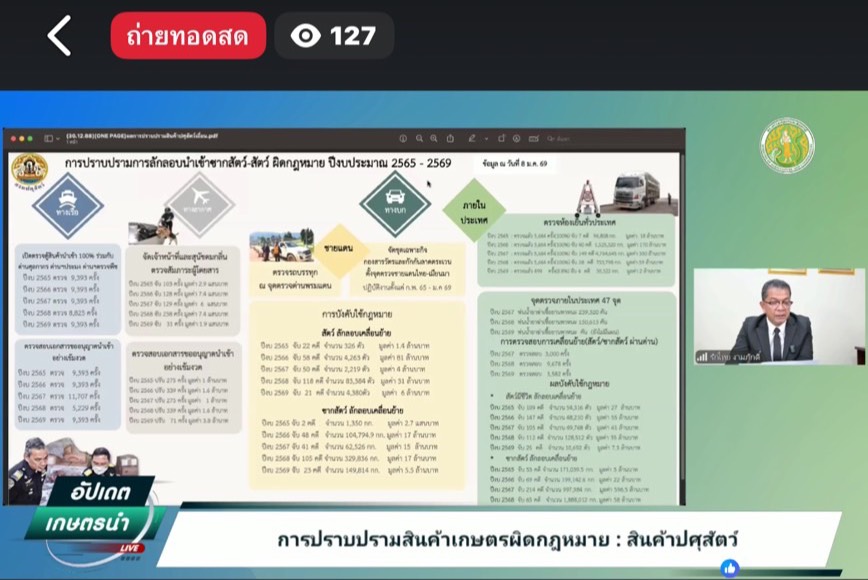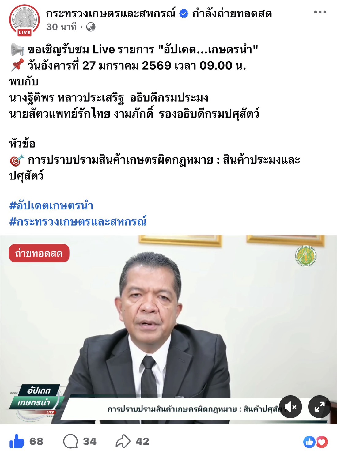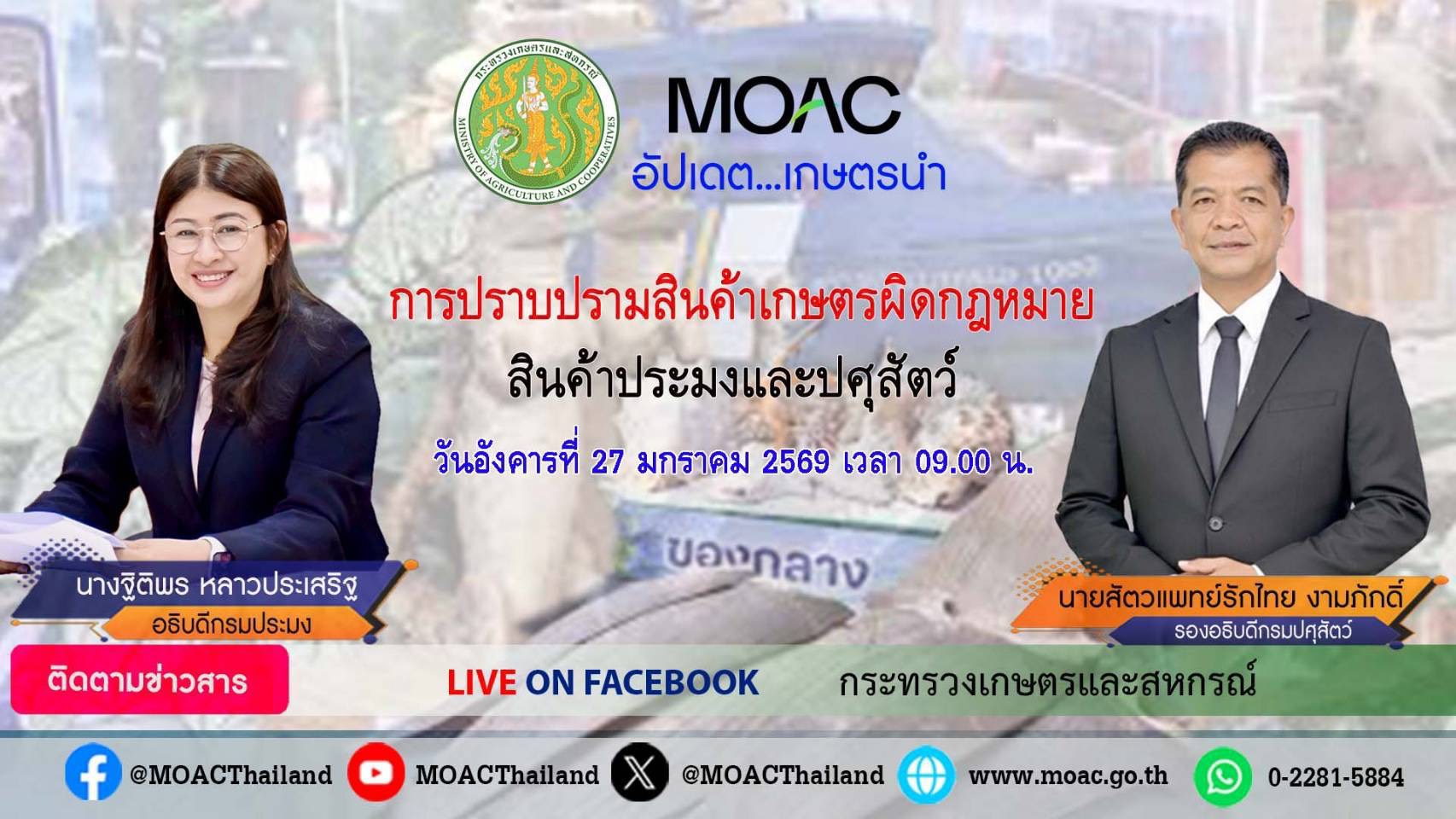 วันอังคารที่ 27 มกราคม 2569 นายสัตวแพทย์สมชวน รัตนมังคลานนท์ มอบหมายให้ นายสัตวแพทย์รักไทย งามภักดิ์ รองอธิบดีกรมปศุสัตว์ และโฆษกกรมปศุสัตว์ ร่วมกับ กรมประมงโดย นางฐิติพร หลาวประเสริฐ อธิบดีกรมประมง จัดรายการ “อัพเดต เกษตรนำ“ ประจำปีงบประมาณ 2569 ในประเด็นหัวข้อ “การปราบปรามสินค้าเกษตรผิดกฎหมาย“ ถ่ายทอดสดผ่านทาง Facebook Live กระทรวงเกษตรและสหกรณ์