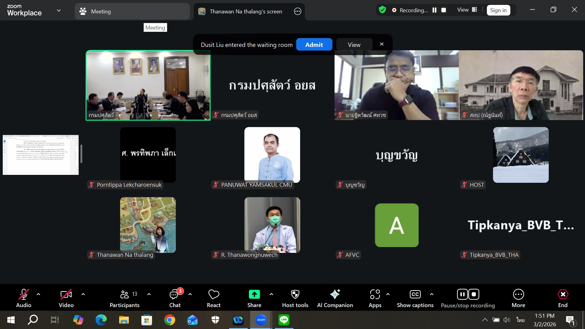 วันจันทร์ที่ 02 มีนาคม 2569 เวลา 13.30 น. นายสัตวแพทย์สมชวน รัตนมังคลานนท์ อธิบดีกรมปศุสัตว์ เป็นประธานการประชุมคณะทำงานขับเคลื่อนการพัฒนาด้านวัคซีนและยาสัตว์ของกรมปศุสัตว์ ครั้งที่ 2/2569 โดยมีนายสัตวแพทย์อุดม เจือจันทร์ รองอธิบดีกรมปศุสัตว์ ผู้บริหารกรมฯ และเจ้าหน้าที่ที่เกี่ยวข้อง เข้าร่วมการประชุมโดยพร้อมเพรียงกัน ณ ห้องประชุมม้ากัณฐกะ ตึกอำนวยการ ชั้น 1 กรมปศุสัตว์ พญาไท กรุงเทพฯ และผ่านระบบประชุมทางไกล Zoom Meeting ทั้งนี้ เพื่อพิจารณากรอบการกำกับดูแลผลิตภัณฑ์ออโตจีนัสวัคซีน (Autogenous Vaccine) สำหรับสัตว์
