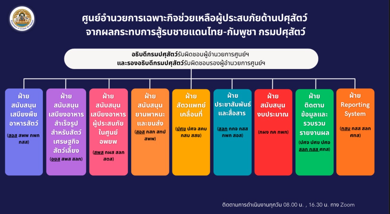 กรมปศุสัตว์ จัดตั้งศูนย์อำนวยการเฉพาะกิจช่วยเหลือผู้ประสบภัยด้านปศุสัตว์ จากผลกระทบการสู้รบชายแดนไทย – กัมพูชา ติดตามสถานการณ์อย่างใกล้ชิดตลอด 24 ชั่วโมง