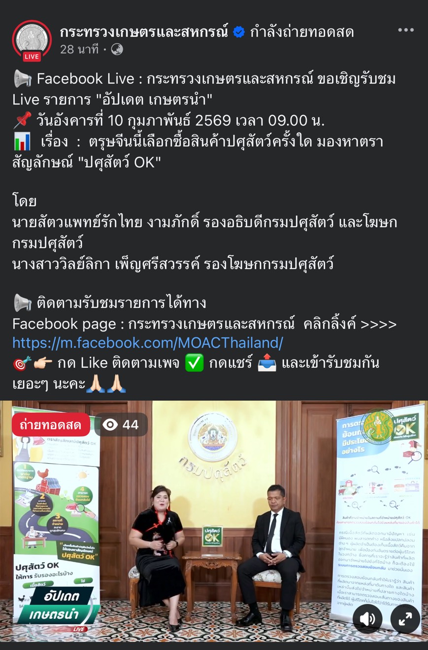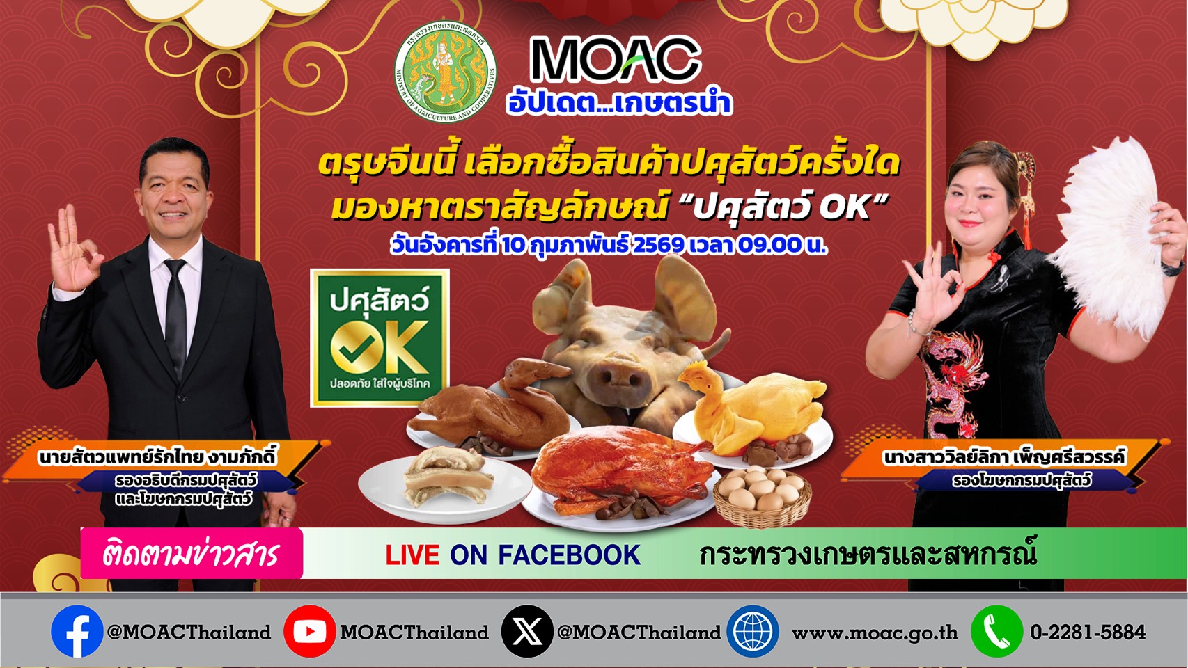 วันอังคารที่ 10 กุมภาพันธ์ 2569 นายสัตวแพทย์สมชวน รัตนมังคลานนท์ มอบหมายให้ นายสัตวแพทย์รักไทย งามภักดิ์ รองอธิบดีกรมปศุสัตว์ และโฆษกกรมปศุสัตว์ พร้อมด้วยนางสาววิลย์ลิกา เพ็ญศรีสวรรค์ รองโฆษกกรมปศุสัตว์ จัดรายการ “อัพเดต เกษตรนำ“ ประจำปีงบประมาณ 2569 ในหัวข้อ “ตรุษจีนนี้เลือกซื้อสินค้าปศุสัตว์ครั้งใด มองหาตราสัญลักษณ์ปศุสัตว์ OK” ถ่ายทอดสดผ่านทาง Facebook Live กระทรวงเกษตรและสหกรณ์