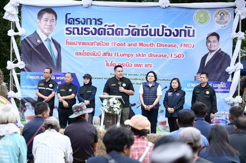 วันพุธที่ 29 ตุลาคม 2568 นายสัตวแพทย์สมชวน รัตนมังคลานนท์ อธิบดีกรมปศุสัตว์ มอบหมายให้ นายสัตวแพทย์บุญญกฤช ปิ่นประสงค์ รองอธิบดีกรมปศุสัตว์ เข้าร่วมพิธีเปิดโครงการรณรงค์ฉีดวัคซีนป้องกันโรคปากและเท้าเปื่อย และโรคลัมปีสกิน ในพื้นที่จังหวัดสุรินทร์ โดยมีนายอามินทร์ มะยูโซ๊ะ รัฐมนตรีช่วยว่าการกระทรวงเกษตรและสหกรณ์ เป็นประธานในพิธี มีคณะผู้บริหารกระทรวงเกษตรและสหกรณ์ และเจ้าหน้าที่ที่เกี่ยวข้องเข้าร่วม ณ บริเวณตลาดนัดโค-กระบือ อำเภอศีขรภูมิ จังหวัดสุรินทร์