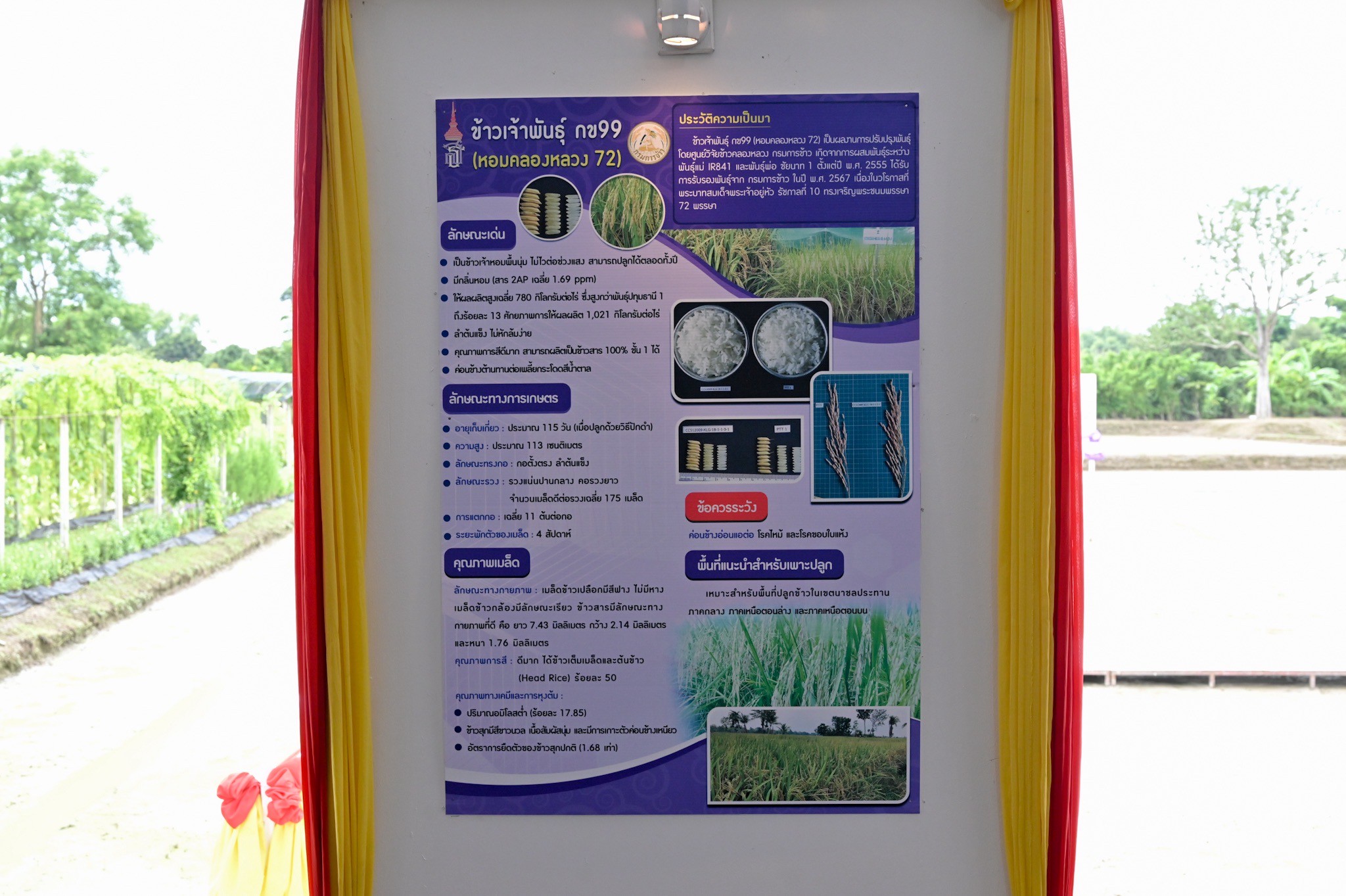 สำหรับข้าวที่ทรงปลูกในครั้งนี้คือข้าวพันธุ์ กข99(หอมคลองหลวง 72) เป็นพันธุ์ข้าวเจ้าหอมพื้นนุ่ม มีกลิ่นหอม ไม่ไวต่อแสง สามารถปลูกได้ตลอดปี มีอายุเก็บเกี่ยวสั้นประมาณ 115 วัน โดยวิธีปักดำ ค่อนข้างทานต่อเพลี้ยกระโดดสีน้ำตาล ให้ผลผลิตเฉลี่ย 1,021 กิโลกรัม/ไร่ สำหรับพื้นที่แนะนำควรปลูกพื้นที่นาชลประทาน ภาคกลาง ภาคเหนือตอนล่าง และภาคเหนือตอนบน ข้อจำกัดคืออ่อนแอต่อโรคขอบใบแห้ง และเพลี้ยกระโดดสีน้ำตาล และทรงเสด็จฯกลับ โดยรถพระที่นั่ง
